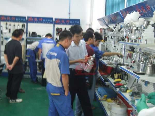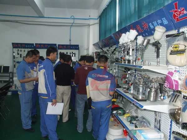 龍神講師向一汽馬自達(dá)的師傅介紹意大利威彩噴槍的優(yōu)點(diǎn)